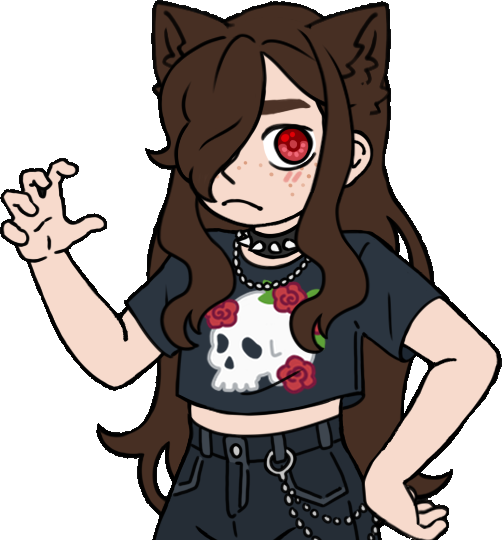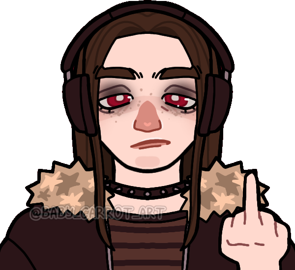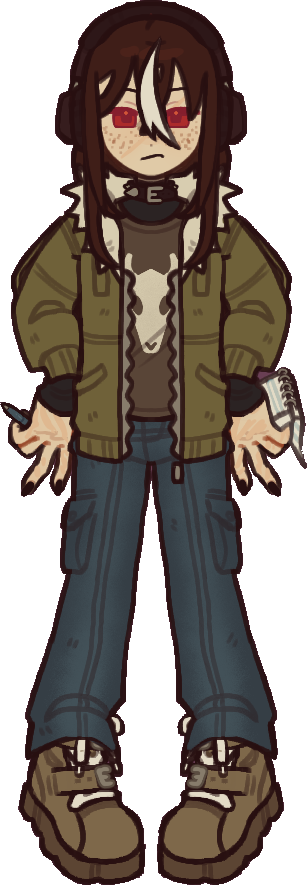Kris is a relatively lanky person — they have freckles, long brown hair, and brown eyes that look red under certain light and reflect in the dark. They have scars on their face, arms, and hands from being turned, and then subsequently from surviving in the wild. Kris's clothing style leans toward grunge, but they'll wear anything comfortable that will keep them warm — they prioritize function over fashion.