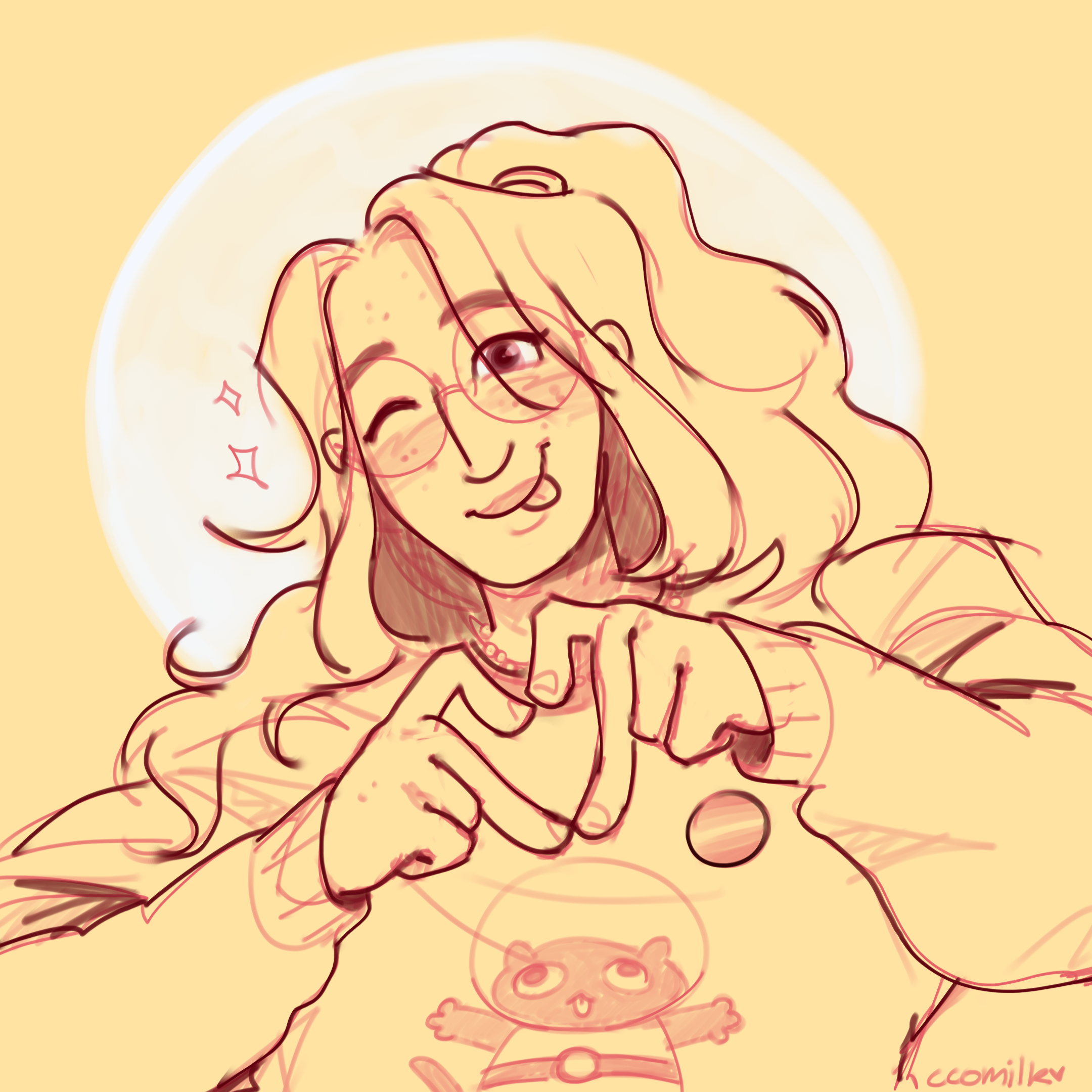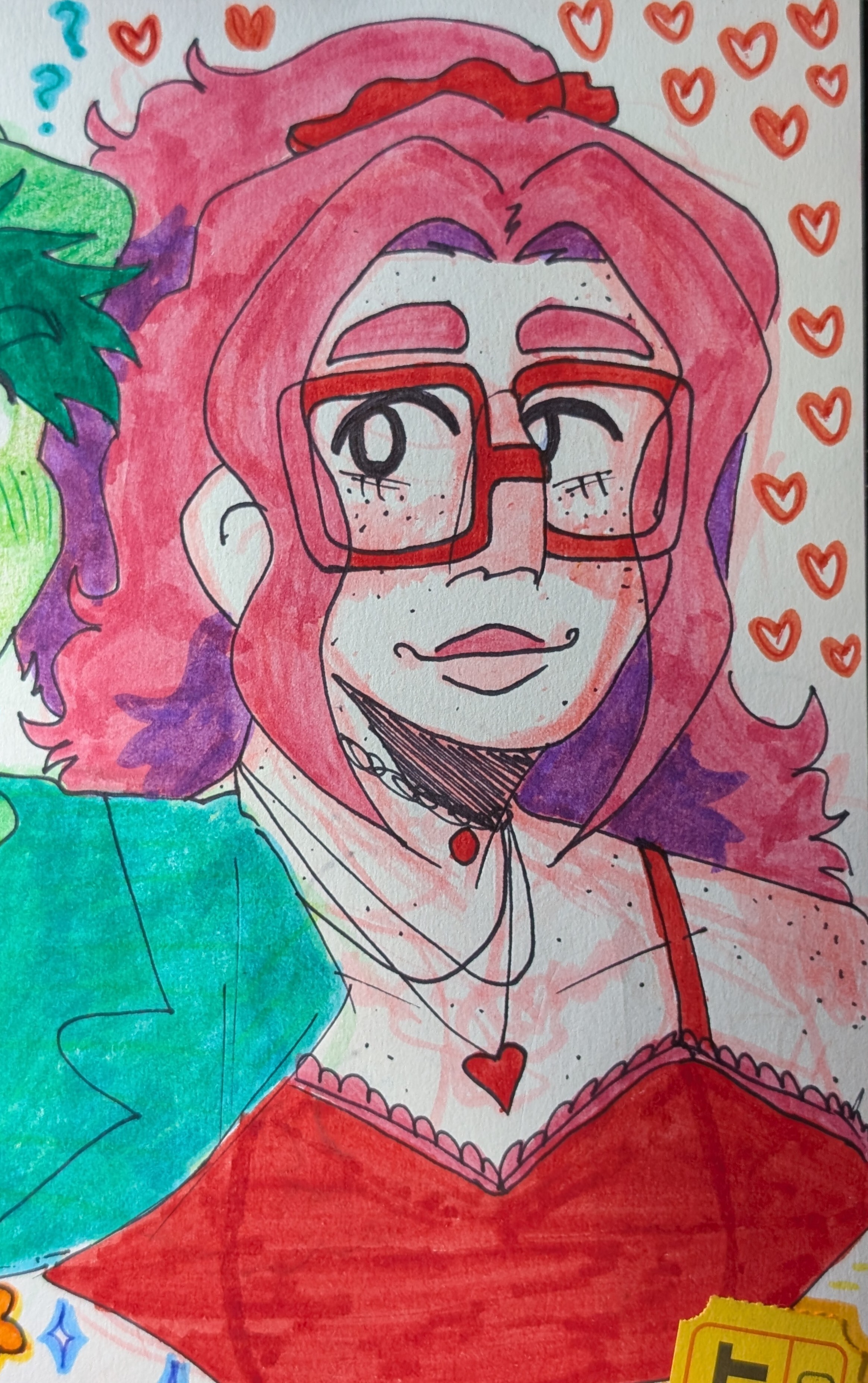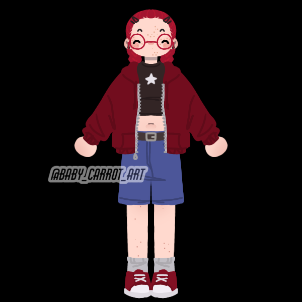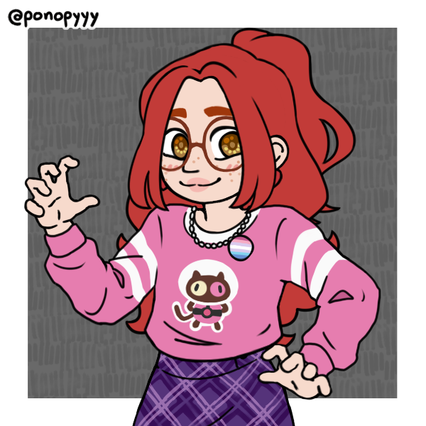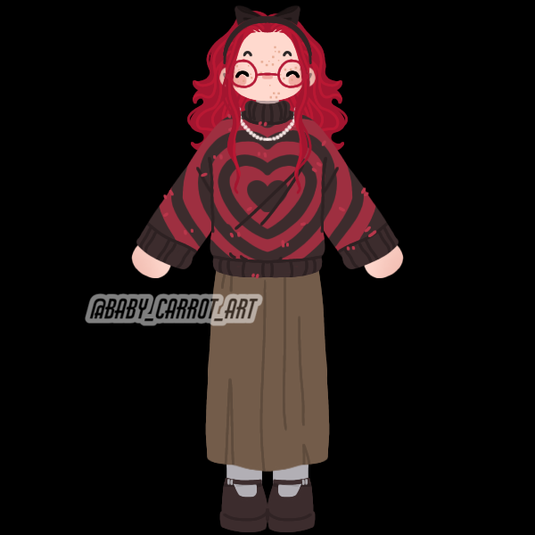 Rose is a very tall person with long red hair, usually with a hairband in it. She has freckles on her cheeks and big red glasses that cover most of her face. Her clothing style is mainly feminine with lots of bright colours and graphic designs — the things that show up in her clothing the most are the colour red and apples. She buys a lot of clothing and accessories from small Etsy stores.