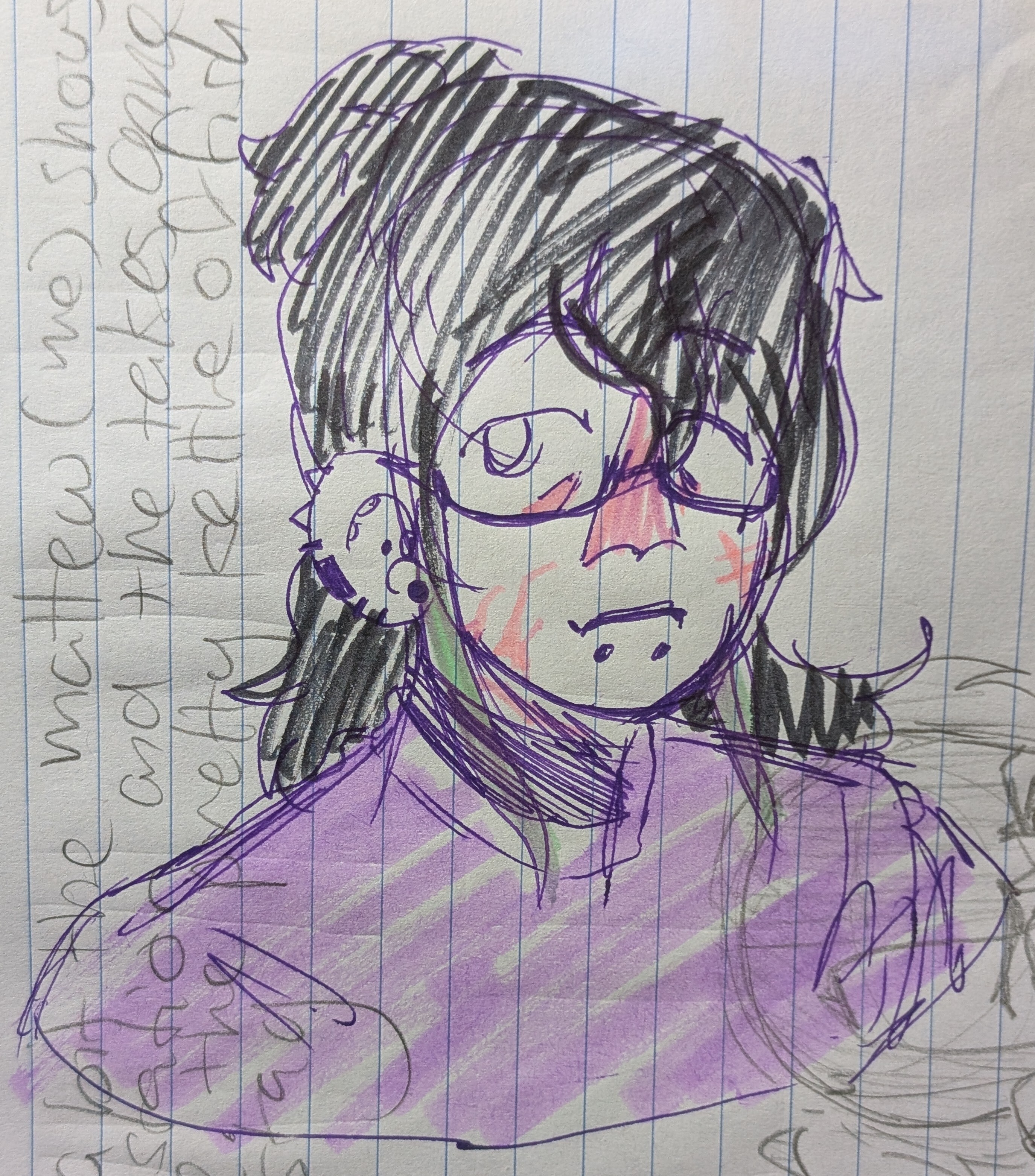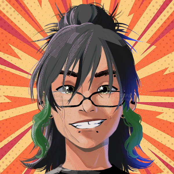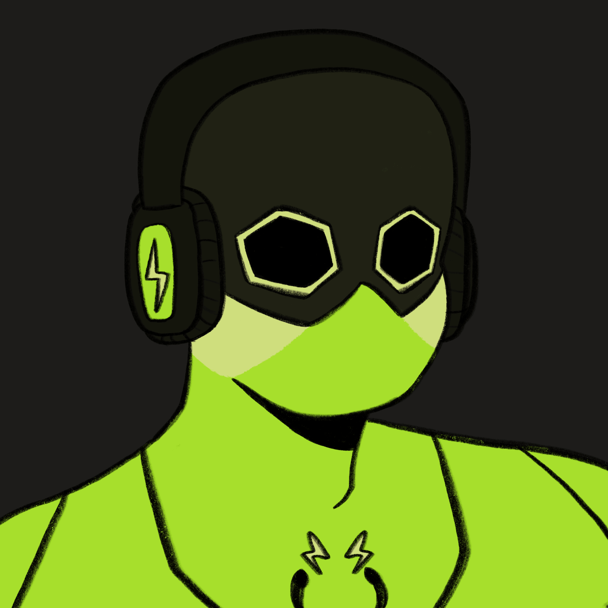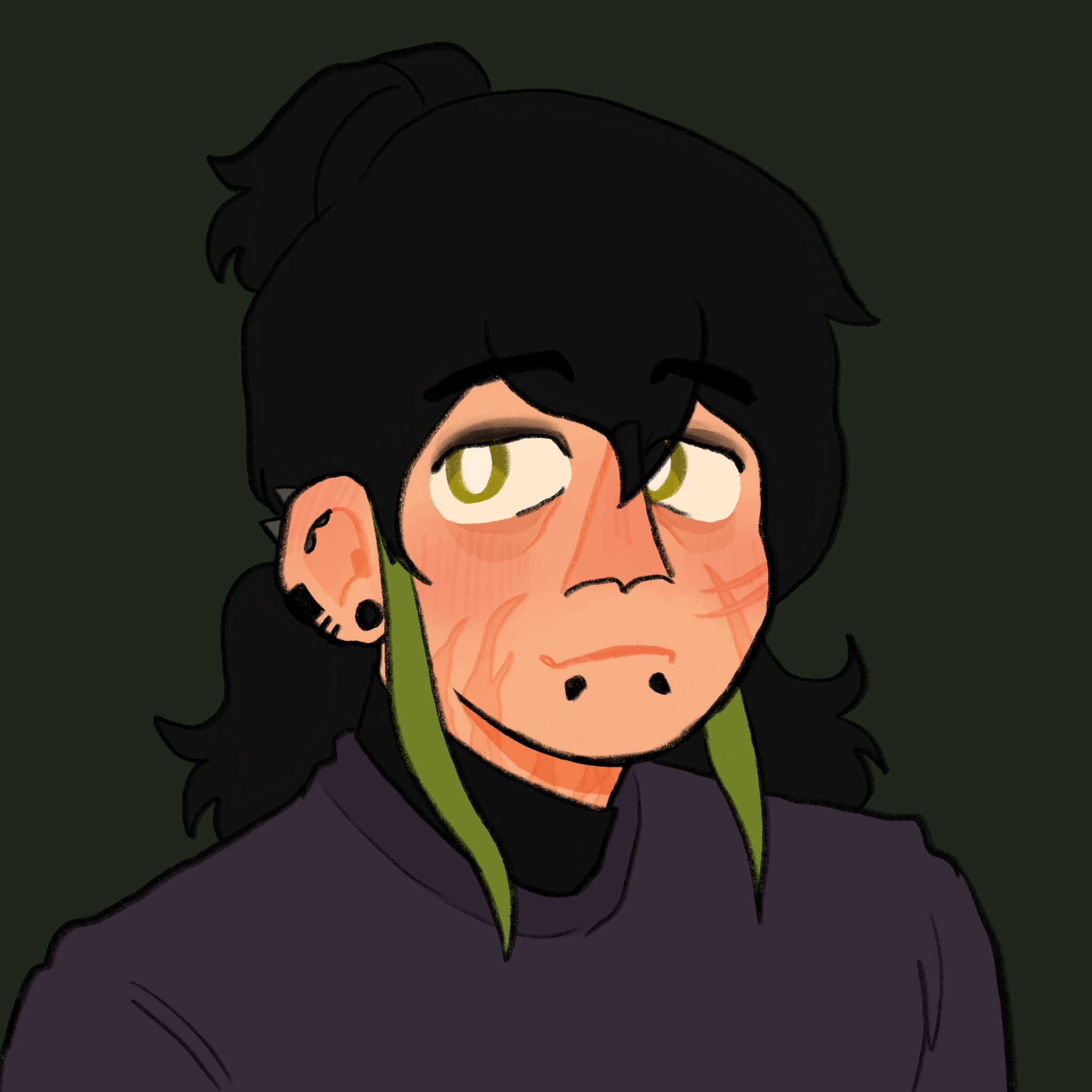 Vic is a relatively short person with shoulder-length black hair with some green-dyed side-strands. He has quite a few scars from different things in his personal life and his superhero life. He has lots of ear piercings and has snake bite piercings. He also has a toothgap.